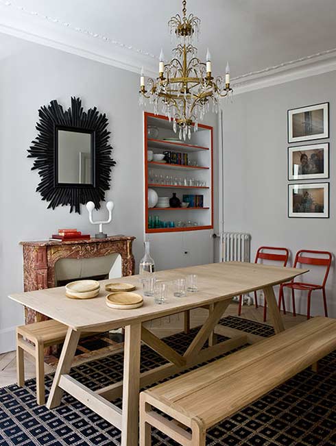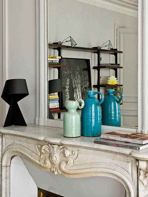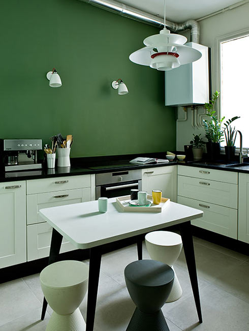 Sans toucher au plan existant, l’appartement devait être rénové pour mettre en valeur ses atouts haussmanniens (parquet point de Hongrie, cheminée, moulures). L’ensemble des pièces d’eau a été rénové. La cuisine a été optimisée avec un plan de travail en granit de Zimbabwe en L et la niche habillée d’étagères. Un papier peint vient réchauffer l’ambiance avec une petite table dinatoire sur mesure. Le nouveau plan de la sdb avec 2 lavabos en alcôve offre 2 espaces distincts. Son carrelage noir et vert rappelle les salles de bain anciennes. Le parquet a été décapé et blanchit dans tout l’appartement pour apporter de la luminosité. Le salon et la salle à manger ont accueilli du mobilier actuel mixé avec des pièces anciennes chinées aux puces de St Ouen.